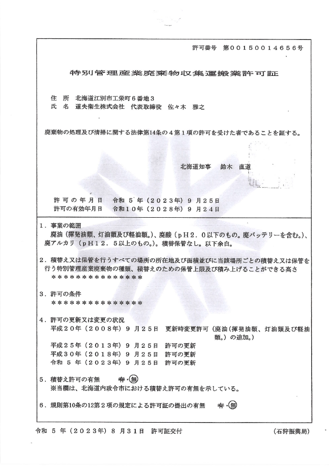 特別管理産業廃棄物収集運搬業許可証(北海道)
